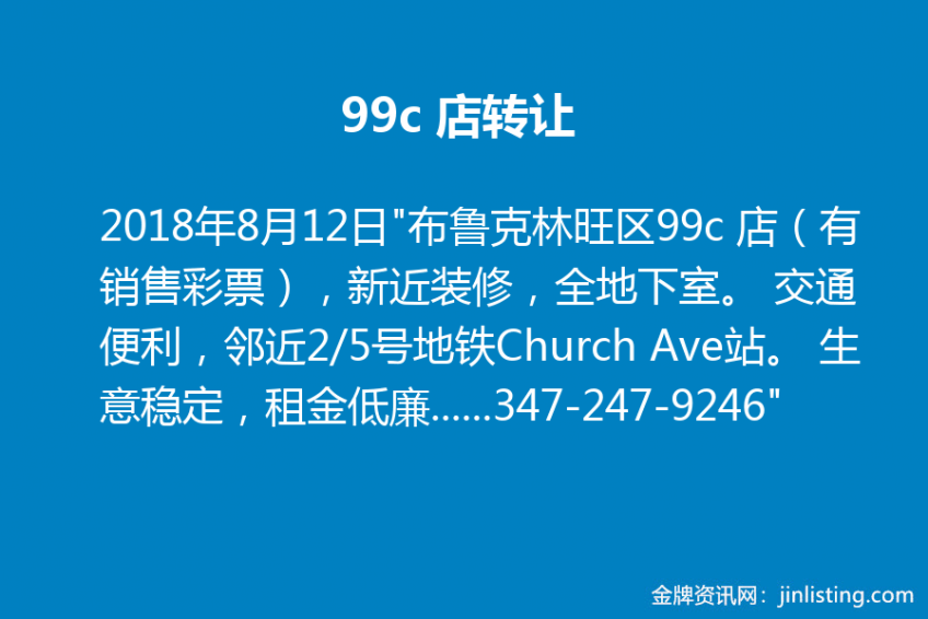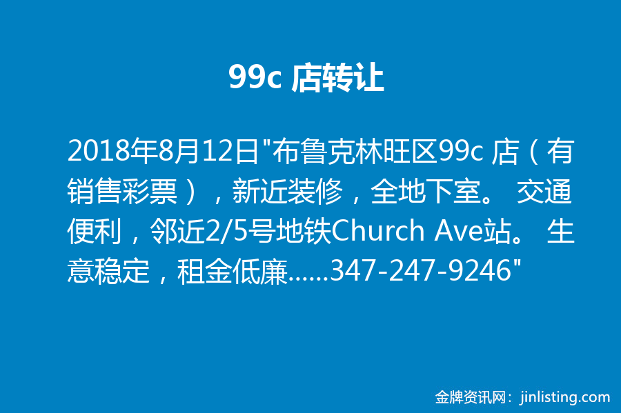 ****99c 店转让**** “布鲁克林旺区99c 店(有销售彩票),新近装修,全地下室。 交通便利,邻近2/5号地铁Church Ave站。 生意稳定,租金低廉,租约长。 因店主有其他生意,无发兼顾,现廉价转让。 有意者务请英语致电或短信联络(店主非华裔): 347-247-9246”