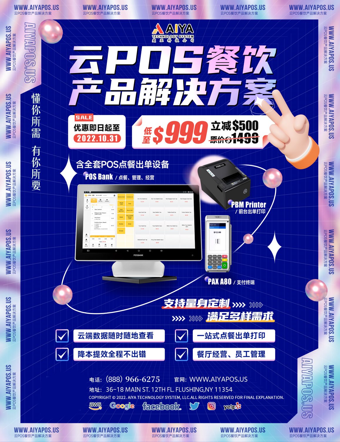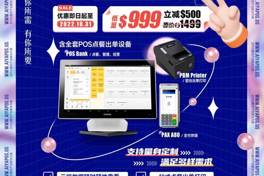 AIYA科技|立减$500,全套餐馆pos产品解决方案低至$999,或选择$89/mo