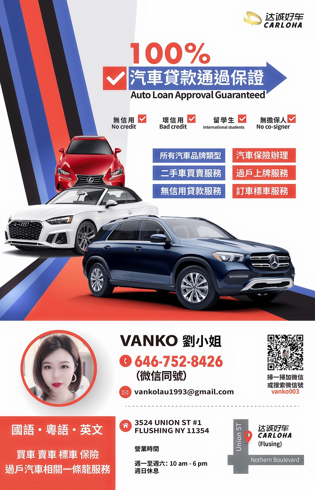 vanko 刘小姐 达诚好车 carloha 法拉盛 onenicecar.com提供检测、拍卖、收付款、过户、物流等全交易链服务,用最好的市场价格,快速完成交易。 购买车辆后,提供保险,年检,交通局,贷款一条龙服务。没标到车分文不取。不仅为大家提供最合理的购车建议,一条龙售后服务,售后咨询服务,还能提供通过率接近100%的(无信用贷款服务,留学生贷款服务,坏信用贷款服务)。 粤语 英文 普通话 微信号vanko003 电话646-752-8426 邮箱vankolau1993@gmail.com3524 Union St #1, Flushing, NY 11354