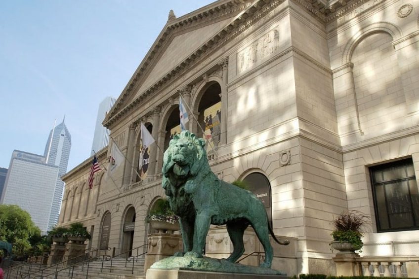 芝加哥艺术博物馆修建于1891年,位于芝加哥市中心,密歇根湖湖畔,由三幢三层建筑联接而成。外观呈维多利亚风格,门前有两只巨大的青铜狮子,其中甚至有铁路从中穿过(是故在馆中游览时偶尔会听到火车轰鸣之声),其中大小展室、长廊上百个,收集展品极为丰富,以绘画,雕塑为主,辅有建筑,摄影、手工艺、纺织等,时间跨度由公元前3000年古埃及的古陶乃至当代的波普艺术,以希腊、罗马、欧洲、美国的艺术品为主,兼收印度、东南亚、中国、日、韩、非洲与美洲的艺术品,简直可以称为是万国博物馆。是美国三大博物馆之一。