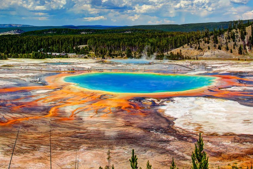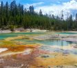 黄石公园面积最大的温泉池是“大棱镜温泉”(Grand Prismatic Spring),池面直径大约110公尺,水温高达85℃,。如果想一窥“大棱镜温泉”全貌就必须搭机观赏或登高山远观,但一般游客沿着步道行走,还是可以一览有如彩虹色彩,缤纷绚丽,令人惊艳的大棱镜。