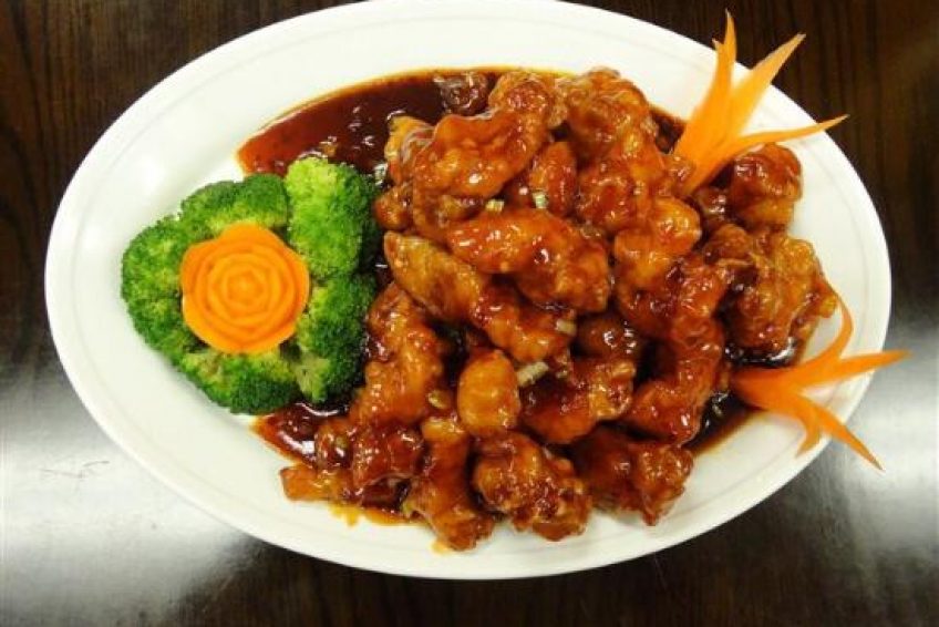 S4. Sesame Chicken chunks of chicken with brown sauce and broccoli with sesame seeds on the top.  9.75
