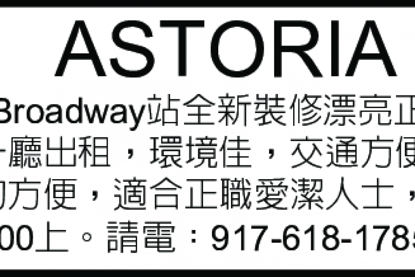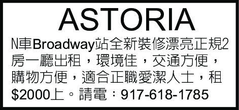 N車Broadway站全盡新裝修漂亮正規二房一廳交通方便環境佳購物方便適合正職愛潔人士租2000上。電917-618-1785