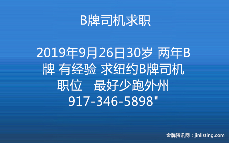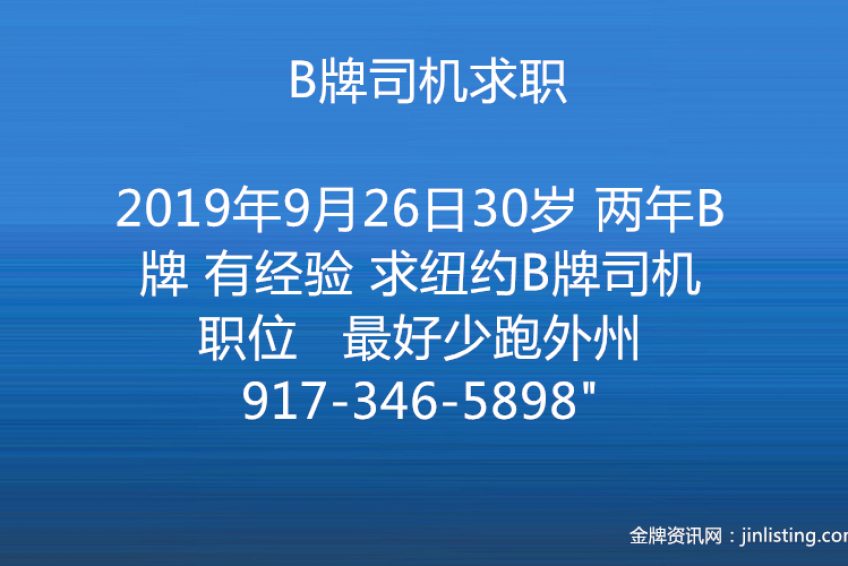 B牌司机求职 “30岁 两年B牌 有经验 求纽约B牌司机职位 最好少跑外州 917-346-5898”