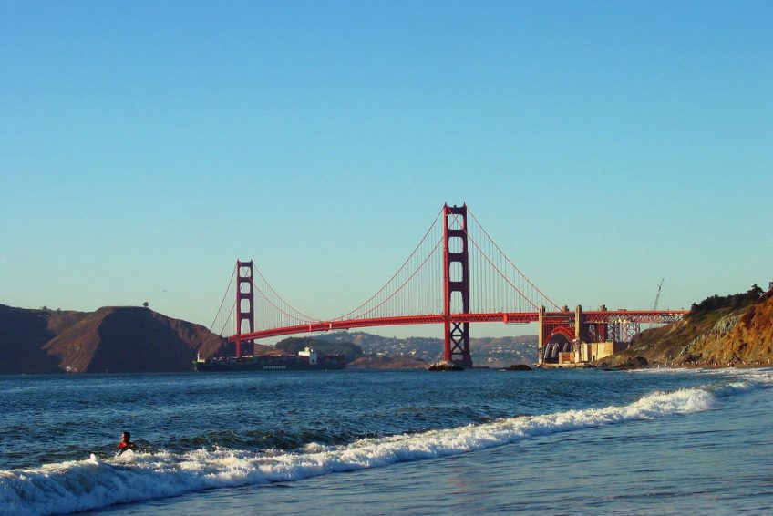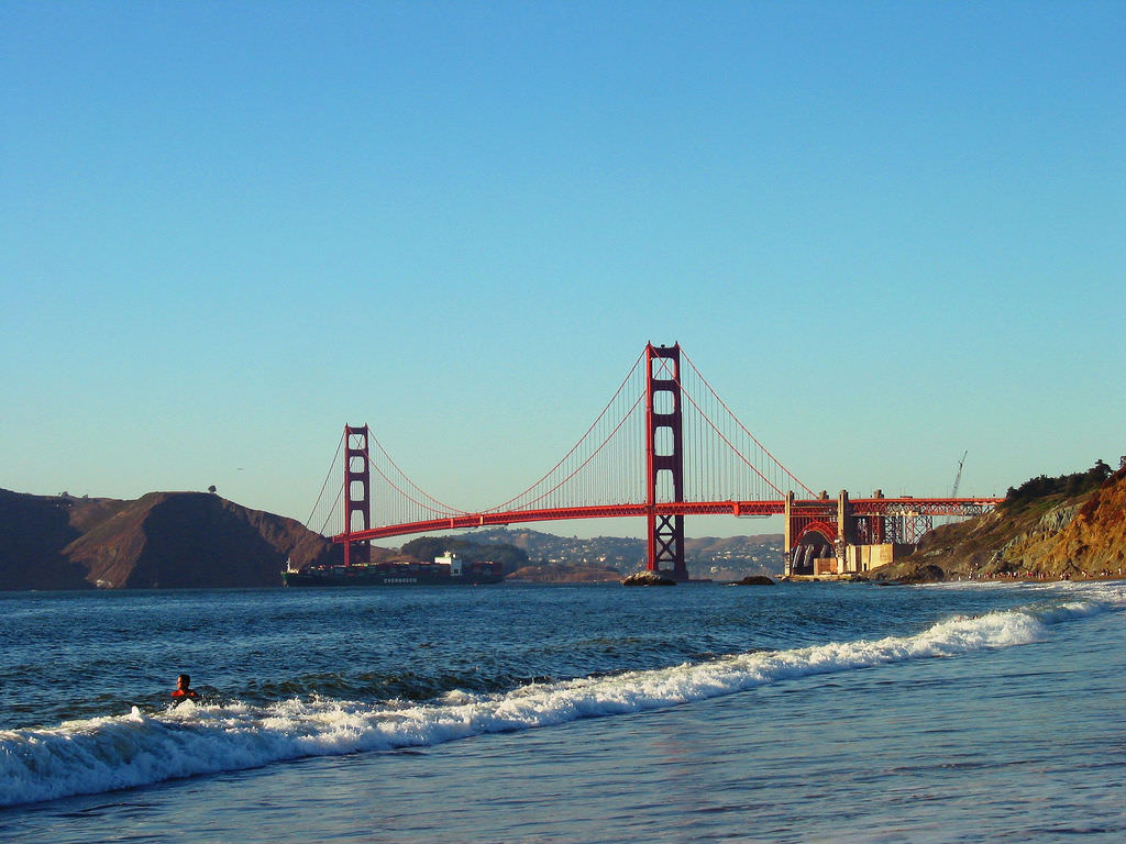 一英里长的贝克海滩位于崎岖的悬崖西侧的金色大门脚下。暗流和波浪游客不能在海滩游泳,但它提供了可以拍摄金门大桥全景的极佳位置。