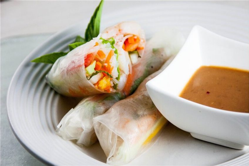 Spring Roll (Porpia) clear noodles with taro and vegetables wrapped in a delicate egg roll skin. deep-fried and served with tangy plum sauce.  4.95
