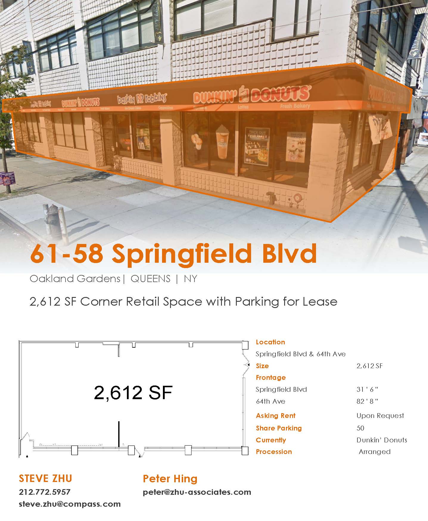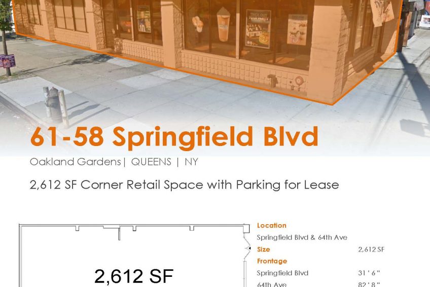 位于纽约皇后区斯普林菲尔德大道61-58号2,612SF街角零售空间,地理位置优越,临街面大,坐落于繁华的商业区中心。室内宽敞、设计专业,配备大型展示窗户和足够的商品展示空间。由于其得天独厚的地理位置和高度的可见性,该物业非常适合餐厅,各种零售业务以及医疗诊所,能够吸引并服务多样化的客户群。详情请联系:646.617.7762。