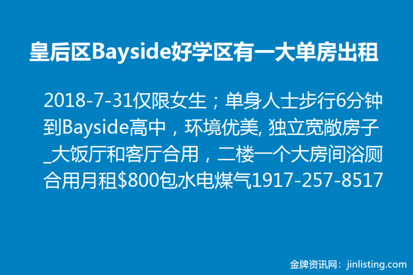 Bayside一流学区(26)步行6分钟到Bayside高中,环境优美, 独立宽敞房子_大饭厅和客厅合用,二楼一个大房间浴厕合用月租$800 包水电煤气,适合有爱心,爱清洁的简单学生或单身女性居住,25分钟到达Flushing,临近公车站: Q28、Q13、Q31和直达曼哈顿快車, 有意者可联系: 陈小姐1917–257–8517