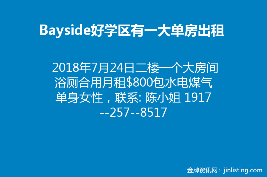 Bayside一流学区(26)步行6分钟到Bayside高中,环境优美, 独立宽敞房子_大饭厅和客厅合用,二楼一个大房间浴厕合用月租$800 包水电煤气,适合有爱心,爱清洁的简单学生或单身女性居住,25分钟到达Flushing,临近公车站: Q28、Q13、Q31和直达曼哈顿快車, 有意者可联系: 陈小姐 1917–257–8517