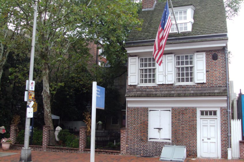 贝茜·罗斯故居(Betsy Ross House)是设计美国国旗星条旗的罗斯夫人的老家。贝茜 • 罗斯(1752-1836)是费城一名优秀的裁缝,她的丈夫在独立战争中丧生。据说在美国独立前夕,华盛顿亲自登门拜访,请她缝制了美国第一面国旗。国旗由13道红、白相间的宽条和13颗星星构成,代表美国独立时的13个州。如今宽条未变,星星已经增加到50颗。每年6月14日是国旗日,这里会举行隆重的纪念活动。