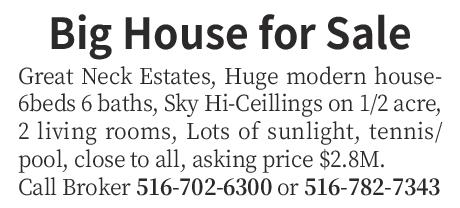Great Neck Estates, Huge modern house-6beds 6 baths, Sky Hi-Ceillings on 1/2 acre, 2 living rooms, Lots of sunlight, tennis/pool, close to all, asking price $2.8M.