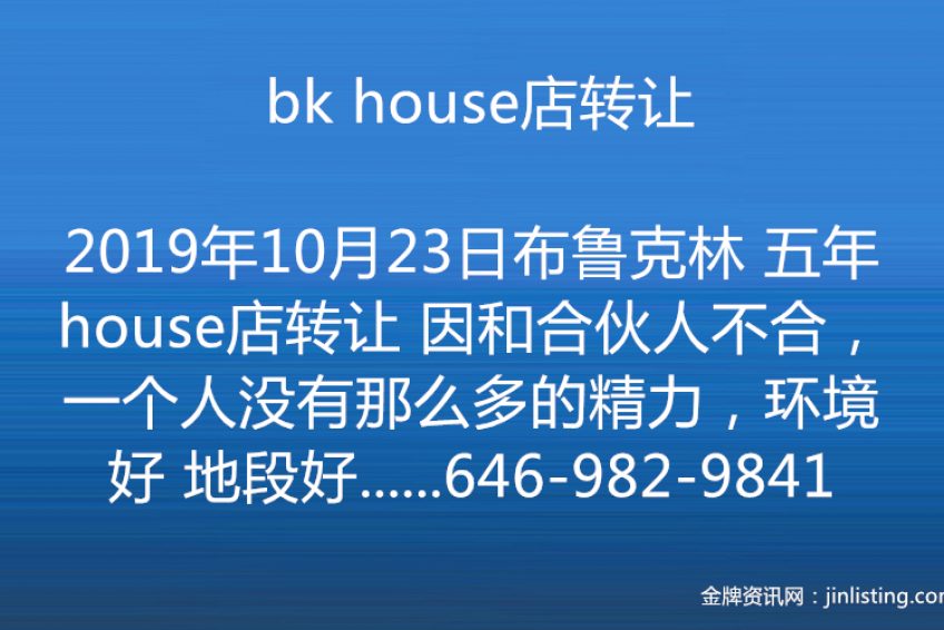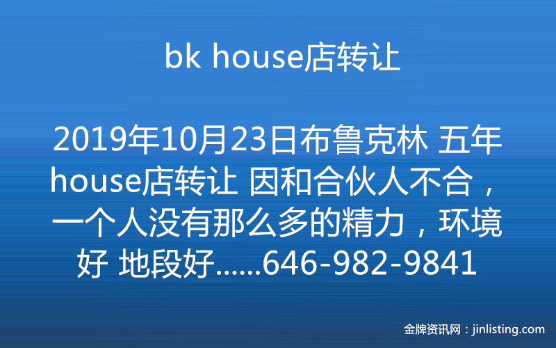 bk house店转让 布鲁克林 五年house店转让 因和合伙人不合,一个人没有那么多的精力,环境好 地段好 便宜低价转让, 每天最少10几个工 ,所以接线电话通通包括在内,想自己做老板的千万不要错过了, 好机会 联系电话646-982-9841