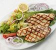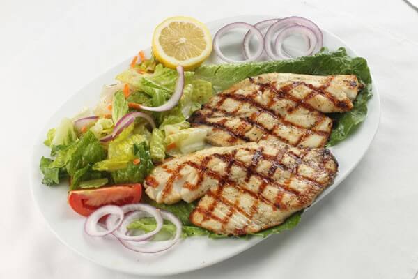 两大块炙烤后的白鱼肉,淋上新鲜的柠檬汁,鱼肉清爽微甜,无刺,最受欢迎菜品。(张学慧/大纪元)