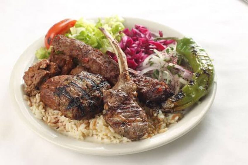 串烤羊肉、香草夹烤羊肉和烤小羊排的组合,配上米饭和蔬菜。也是地中海料理的特色菜之一。(张学慧/大纪元)