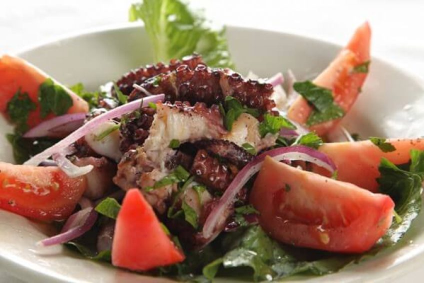 章鱼与大蒜、柠檬汁和醋一起炙烤,再配上蔬菜,Q弹嫩滑,回味无穷。(张学慧/大纪元)