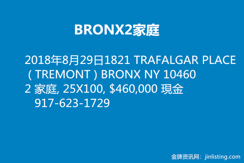1821 TRAFALGAR PLACE ( TREMONT ) BRONX NY 10460 2 家庭, 25X100, $460,000 現金 917-623-1729