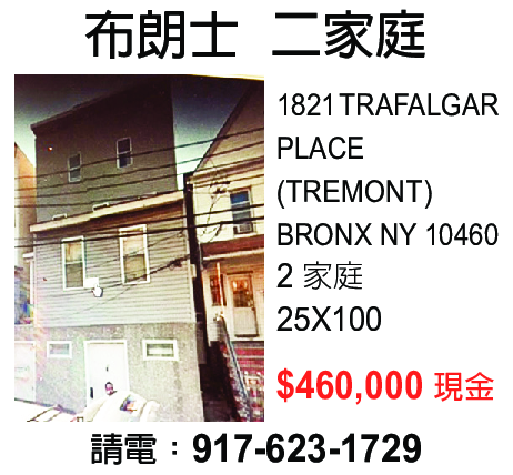 1821 TRAFALGAR PLACE ( TREMONT ) BRONX NY 10460 2 家庭, 25X100, $460,000 現金 917-623-1729