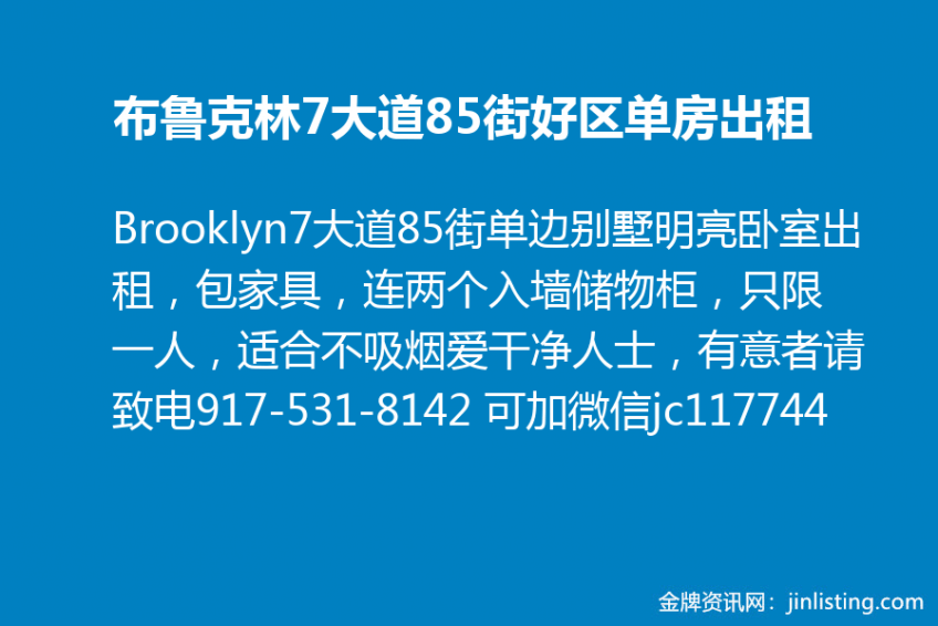 Brooklyn五大道51街,走一分钟到R地铁站,走五分钟左右到N地铁站,附近有超市,银行,洗衣房,健身房。附近还有图书馆,搭地铁20分钟到Manhattan,房间有三个窗,光线充足,房间里已有衣橱,床架,床垫,衣柜,八月一号即可入住。包水电暖气以及网络,适合不吸烟,无宠物,少煮食的学生以及上班人士。房租面议,联络电话 6466237658