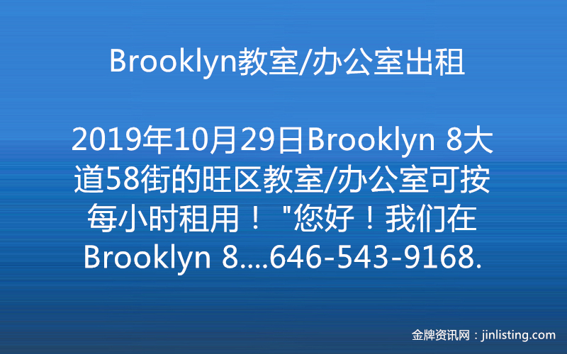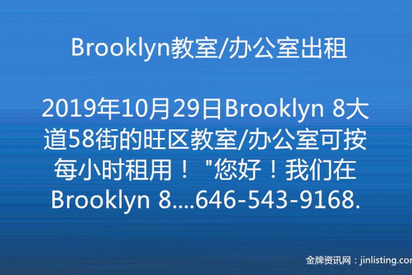 Brooklyn 8大道58街的旺区教室/办公室可按每小时租用! “您好!我们在Brooklyn 8大道58街的旺区黄金地点有宽敞明亮,设施齐全的教室和办公室,如果您是一位老师,正在考虑要在人气兴旺,生源丰富的8大道开您的成人ESL英语课,Pre-K学前班,天才班,课后补习班,周末英数加强班,SAT班,SHSAT班,中文课,美术课,音乐课(钢琴, 小提琴 ,唱歌。。。)等等的项目,我们提供给您这个最经济实用的选择,使您免去了在8大道每月昂贵的房租水电开支压力和教室桌椅设备装修的投资,您只要根据需要使用课室的时间来按小时付费(水电全包),我们最低只收$25一小时,您能挣多少学费都是您的。 或者您也可以固定租下您要的教室或办公室进行您的独立教学和开展工作,我们会给予最低的月租金考虑(水电全包)。 欢迎具有教学经验的老师加盟来丰富8大道社区的孩子课后教育课程: (时间自由,学生一般都选在下午放学后或者周末过来。) 成人ESL英语课,学前班,天才班,课后补习班,周末英数加强班,SAT班,SHSAT班,中文课,美术课,音乐课 钢琴 Piano 小提琴 Violin 唱歌 Singing –Subway Directions: Take the “”Coney Island”” bound N train to “”8 Ave”” stop, walk to 58th ST on 8th Ave. Or take the B9 / B70 bus to come. Ms. Liu at 646-543-9168. Thank you! All the BEST!”