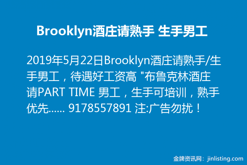 Brooklyn酒庄请熟手/生手男工,待遇好工资高 “布鲁克林酒庄请PART TIME 男工,生手可培训,熟手优先。要求英文流利,做事认真负责,有耐心,会打六合彩有收银经验的优先。工作时间 4:30pm-9pm左右,一周4-5天。店址位于3号地铁线,可以自己开车上下班最好,住法拉盛的必须自己开车上下班(坐地铁不方便),本店待遇好,工资高。 有意者请联系Terry. 之前已经打过电话咨询的朋友如果还有意向,可以再和Terry联系. call/text 9178557891 注:广告勿扰!