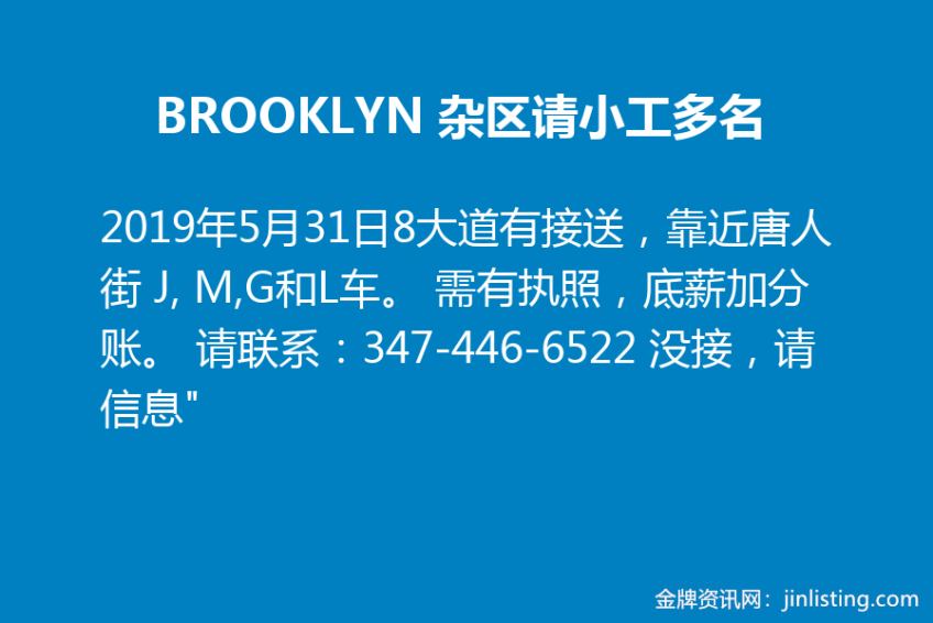 “BROOKLYN 杂区请小工多名,8大道有接送,靠近唐人街 J, M,G和L车。 需有执照,底薪加分账。 请联系:347-446-6522 没接,请信息”
