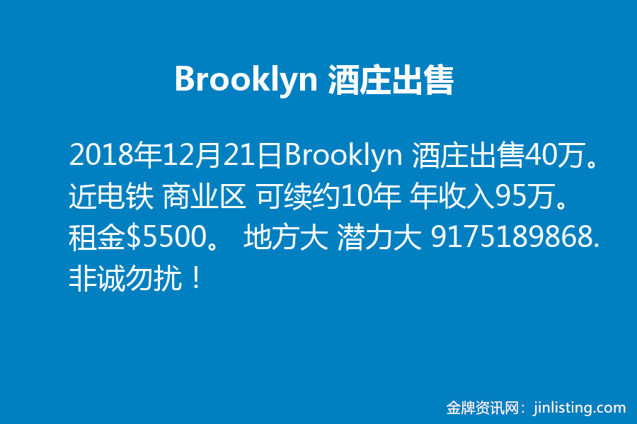 Brooklyn 酒庄出售40万。近电铁 商业区 可续约10年 年收入95万。租金$5500。 地方大 潜力大 9175189868. 非诚勿扰!