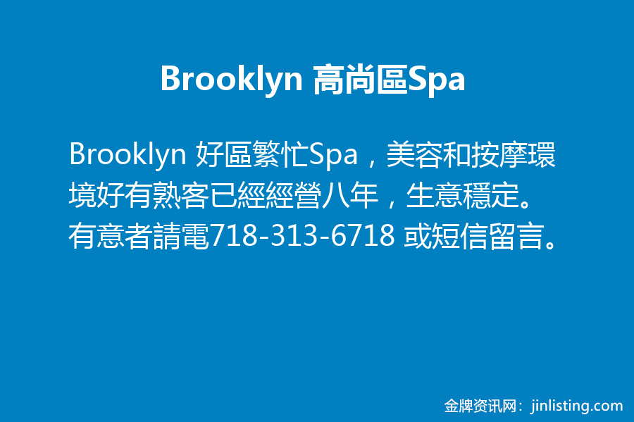 Brooklyn 好區繁忙Spa,美容和按摩環境好有熟客已經經營八年,生意穩定。有意者請電718-313-6718 或短信留言。