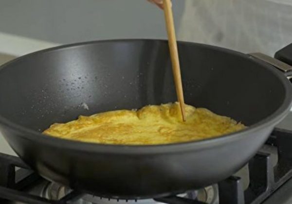 1. 锅热后倒入蛋液,之后盖上锅盖闷一下,翻面后再微煎一下出锅。