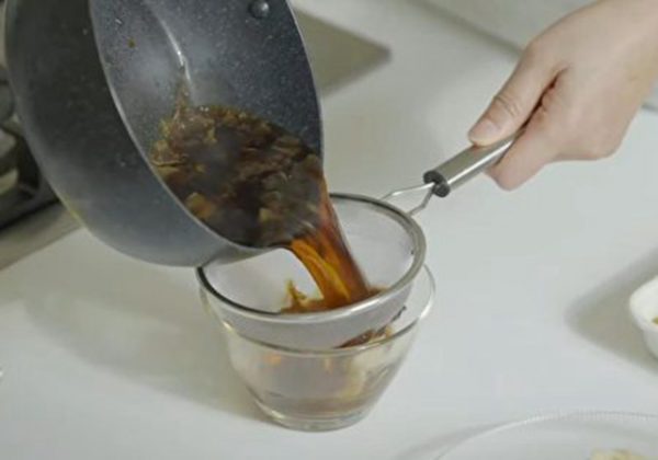将酱油、糖煮开后加入清酒、味醂之后放入柴鱼片,关火浸泡至放凉,过滤后备用。