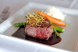 除了有优雅的用餐环境和窗外的无敌夜景,Castaway Restaurant的每一道菜都有精美的摆盘,卖相就已经让人垂咽三尺,即便是一小块简单的牛排,在旁边搭配上几根绿竹笋,胡萝卜和土豆泥增添了丰富的色彩,让人胃口大开,肉质鲜嫩的牛排入口既化,嚼劲十足,沾上盘底味道特别的独家酱料,保证每一口都满足你的味蕾。