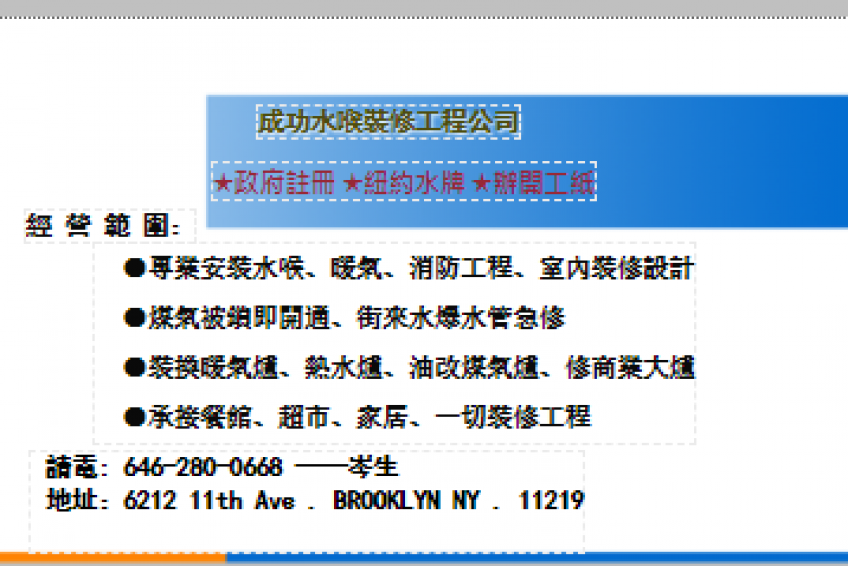 本公司是由政府注册,拥有纽约水牌执照的专业公司,可快速办理开工纸开工。