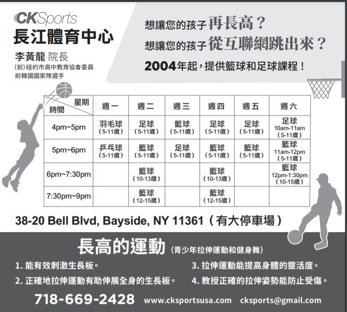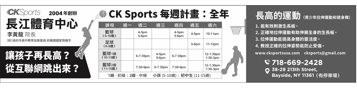 另外周日还设有篮球、足球开放课程(Open Class)(详细课程时间表,请查询学校网站www.cksportsusa.com)。