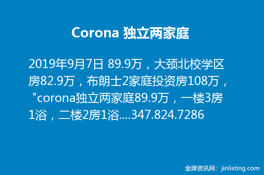 Corona 独立两家庭89.9万,大颈北校学区房82.9万,布朗士2家庭投资房108万, “corona独立两家庭89.9万,一楼3房1浴,二楼2房1浴+超大阁楼(可做两个房间),地税6000,屋大22*45 ,近北方大道,走路9分钟到地铁7号车 大颈北校学区房82.9万,近火车站,屋况保养佳,超低地税。 布朗士NY10461好区2家庭投资房108万,砖石级装修。近白石镇大桥,可改三家庭。 以上房源请电347.824.7286蒋小姐”