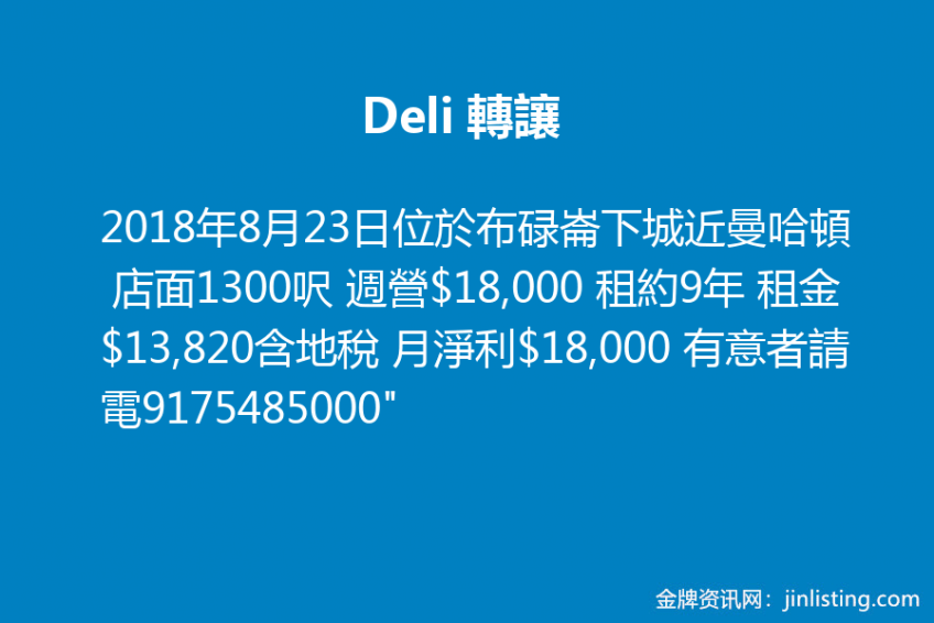 Deli 轉讓 “位於布碌崙下城近曼哈頓 店面1300呎 週營$18,000 租約9年 租金$13,820含地稅 月淨利$18,000 有意者請電9175485000”