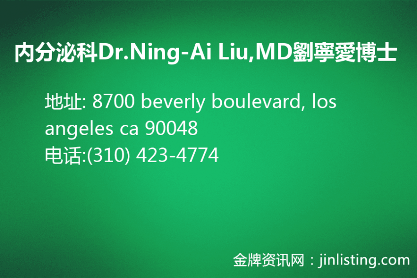 刘宁爱博士是加利福尼亚州洛杉矶的一名内分泌专家,隶属于该地区的多家医院,包括Cedars-Sinai医学中心和Ronald Reagan加州大学洛杉矶分校医学中心。 她从上海交通大学医学院获得医学学位,实践了20多年。 她是Cedars-Sinai医学中心的40名医生之一,也是Ronald Reagan UCLA医学中心的55名专门从事内分泌,糖尿病和代谢的专家之一。