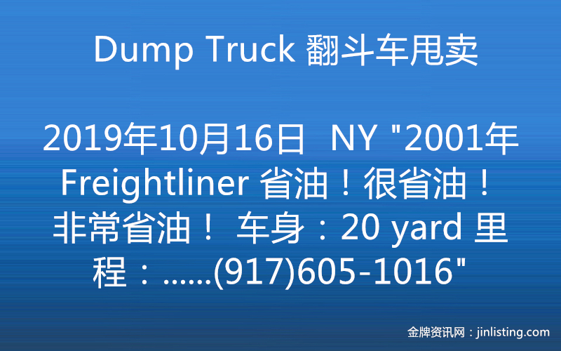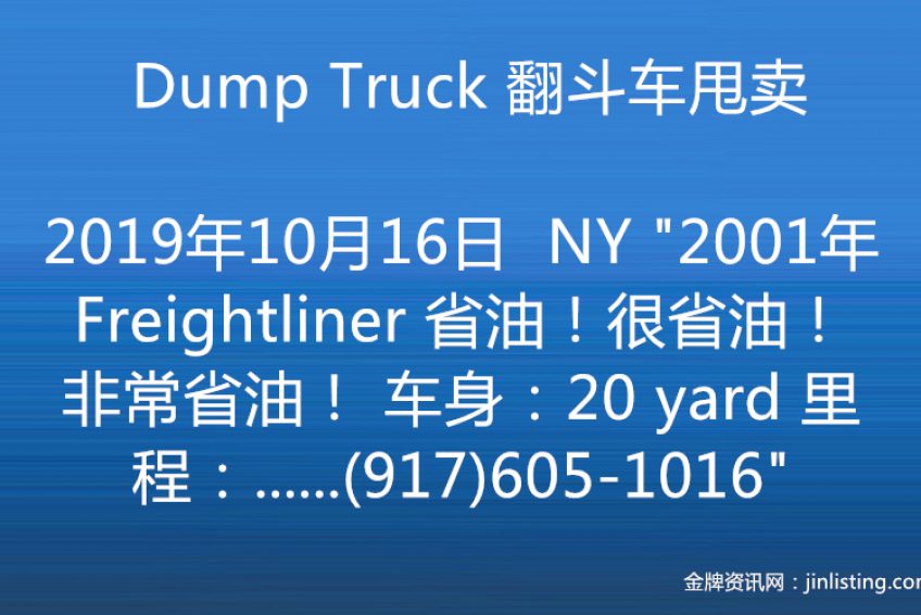 Dump Truck 翻斗车甩卖 NY “2001年Freightliner 省油!很省油!非常省油! 车身:20 yard 里程:150,000 车在纽约市 车保养得很好,没有什么磨损 没有出车祸或其他交通事故 $18,088 如果没人接听请发短信 (917)605-1016”