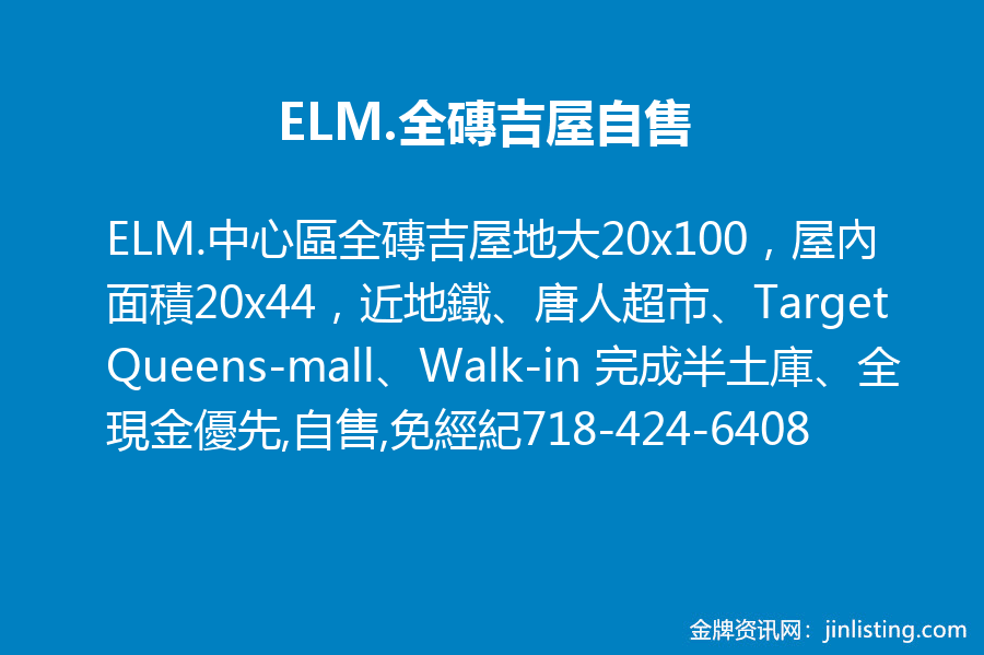 ELM.中心區全磚吉屋地大20×100,屋內面積20×44,近地鐵、唐人超市、Target、Queens-mall、Walk-in 完成半土庫、全現金者優先、屋主自售、經紀免問。718-424-6408 或 347-421-7504