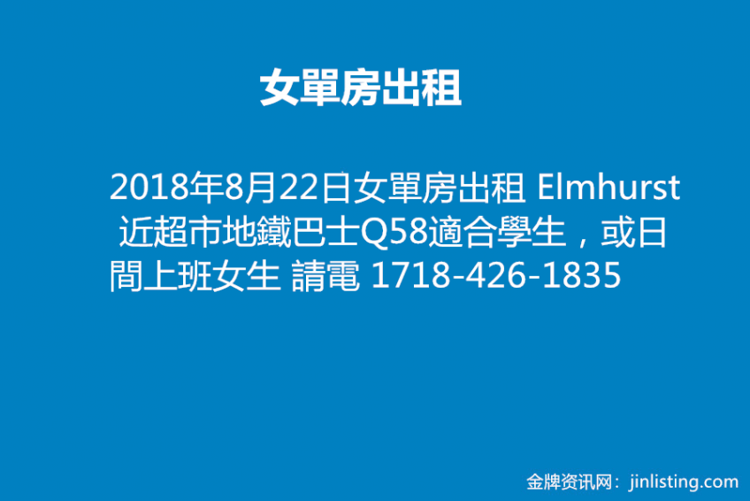 女單房出租 Elmhurst 近超市地鐵巴士Q58適合學生,或日間上班女生 請電 1718-426-1835