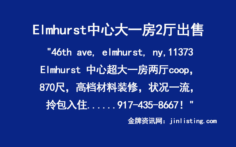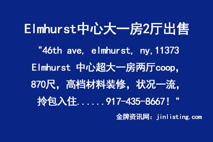 Elmhurst 中心超大一房两厅coop,870尺,高档材料装修,状况一流,拎包入住,仅售38万9!board易通过。管理费935$,除电全包。3分钟bus站Q60, 6分钟地铁M,E,R. 步行超市,broadway 和 Queens blvd 两大商业区,生活及其方便。917-435-8667!”