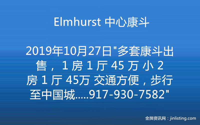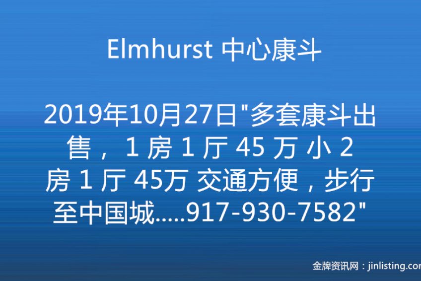 “Elmhurst 中心康斗,多套康斗出售, 1 房 1 厅 45 万 小 2 房 1 厅 45万 交通方便,步行至中国城超市、Queens Center、M/R、7 号地铁 本周六(9月21日)中午 12:00–2:00 公展, 地址:92-18 50th Ave. Elmhurst,NY 11373 联系电话:917-930-7582”