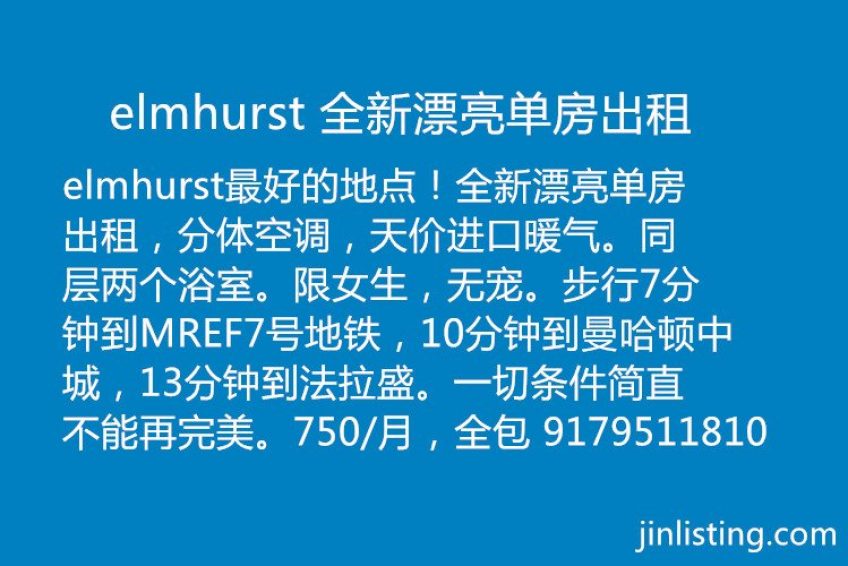 elmhurst最好的地点!全新漂亮单房出租,分体空调,天价进口暖气。同层两个浴室。限女生,无宠。步行7分钟到MREF7号地铁,10分钟到曼哈顿中城,13分钟到法拉盛。一切条件简直不能再完美。750/月,全包 9179511810