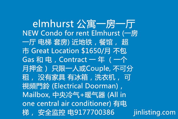 NEW Condo for rent Elmhurst (一房一厅 电梯 套房) 近地铁,餐馆, 超市 Great Location $1650/月 不包 Gas 和 电,Contract 一 年 (一个月押金) 只限一人或Couple, 不可分租, 没有家具 有冰箱,洗衣机, 可視頻門鈴 (Electrical Doorman), Mailbox, 中央冷气+暖气器 (All in one central air conditioner) 有电梯, 安全监控 电9177700386