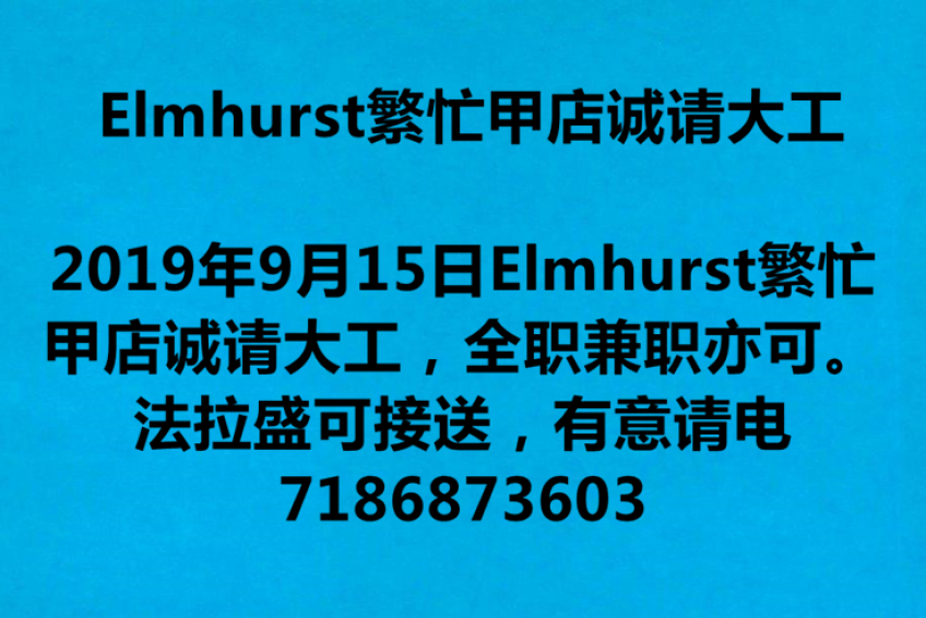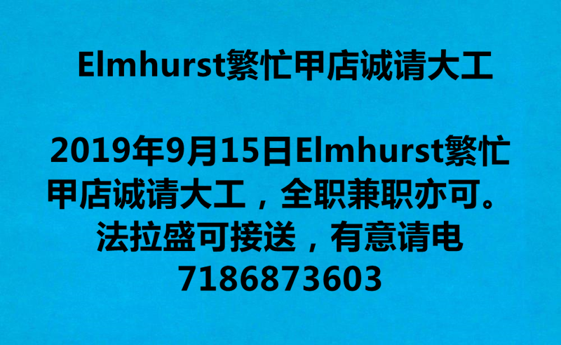 Elmhurst 繁忙甲店诚请大工,全职兼职亦可。法拉盛可接送,有意请电7186873603
