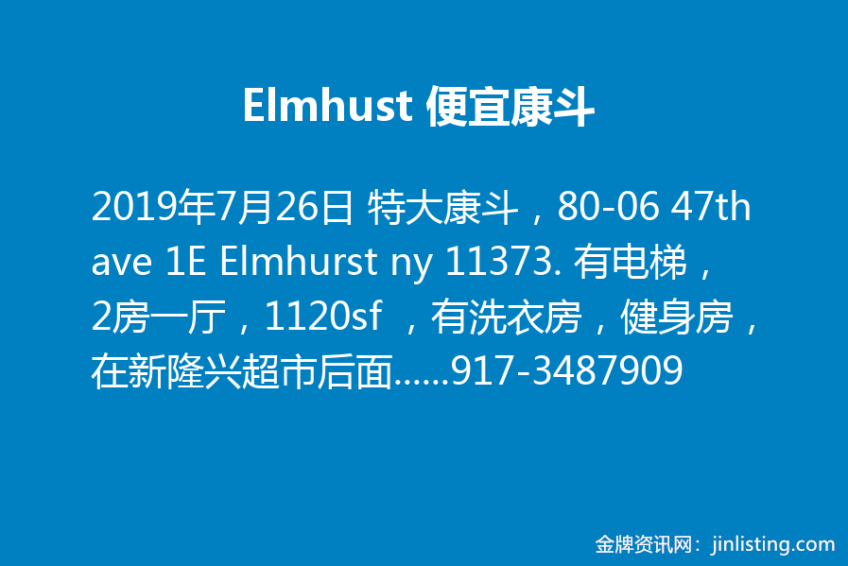 Elmhust 便宜康斗 特大康斗,80-06 47th ave 1E Elmhurst ny 11373. 有电梯, 2房一厅,1120sf ,有洗衣房,健身房,在新隆兴超市后面一条街,2分钟走到
