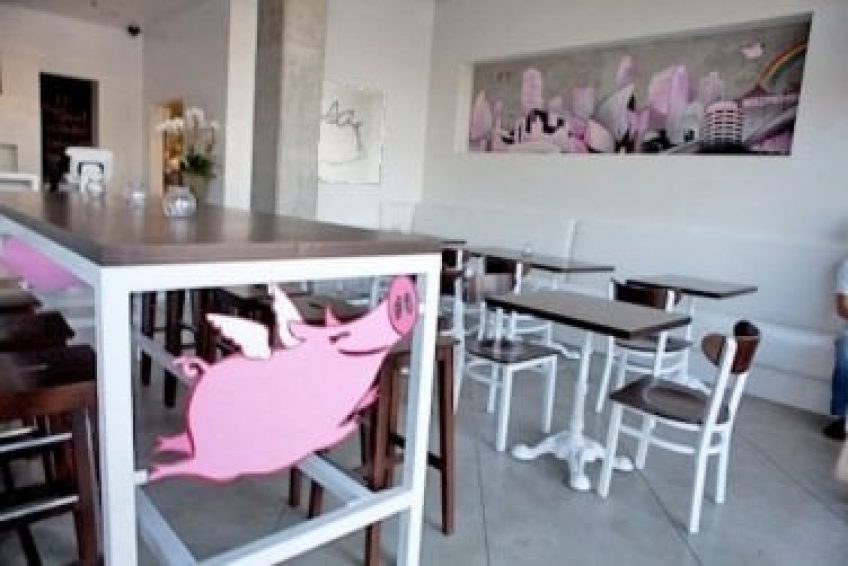 位於洛杉磯市中心小東京地帶的「Flying Pig」(飛翔的小豬)名字很有趣,這是一家融合了美式和日式風格的料理店,最有名的是各種精緻的塔可餅和bun麵包,分量不大很適合亞洲人的胃口。 Flying Pig Cafe La位於小東京中心大道(Central Ave)上,店招上有一隻長翅膀的小豬,這也是餐廳主題,店內有一面牆上,畫有現代風格的洛杉磯市中心街景,天空上面也有這隻長翅膀的小豬,小黑板和玻璃桌上也印有小豬團,給人可愛溫馨的感覺。這裡餐點最有名的要數小塔可餅和bun麵包,小小圓圓的塔可餅面皮上,除了多種口味的豬肉丶牛肉丶雞肉,還有不常吃到的鴨肉,同樣的肉類還可搭配bun麵包,這是一種鹹味小圓麵包,夾一塊豬裡嵴肉,搭配黃瓜和洋蔥,淋上番茄醬,就是這裡有名的Pork Belly Bum。另外這裡還有很多和風味小食,Loco Moco由納豆丶蔬菜丶米飯溷合,蓋上烤麵包片,鋪上一顆煎雞蛋,味道層次豐富;碳烤魷魚腳搭配新鮮蔬菜,口味清爽;新鮮黃瓜泥配合秘製醬料,非常開胃;炸薯條撒上紫菜碎和芝士粉,味道獨特;還有食客大贊這裡的咖哩海鮮拉麵丶日式焗烤意麵等,都是值得一試的精緻餐點。 Flying Pig除了餐廳,還有粉紅色的流動餐車在市中心附近遊走,如果在路上碰到這輛印有長翅膀小豬圖桉的餐車,不妨嚐嚐它家最有名的鴨肉塔可餅和豬裡嵴肉bun麵包,一定不會讓你失望。
