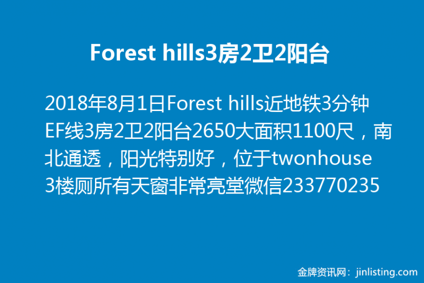 Forest hills近地铁3分钟EF线3房2卫2阳台2650 PS196学区