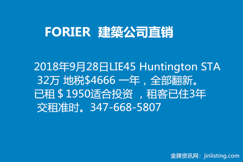 LIE45 Huntington STA 32万 地税$4666 一年,全部翻新。已租$1950适合投资 ,租客已住3年,交租准时。 公司網站:www.forierbuilders.com 加直销 347-668-5807