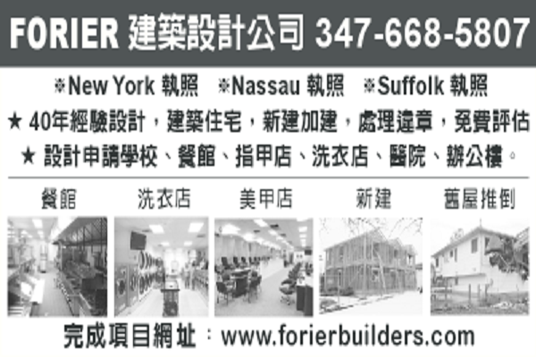 New York执照 Nassau执照 Suffolk执照。 40年经验设计,建筑住宅,新建加建,处理违章,代理上庭。 ×設計、申請新建一、二家庭圖紙和開工紙、免費平估。 ×設計和申請學校、餐館、指甲店、洗衣店、醫院、辦公樓。 完成項目: www.forierbuilders.com