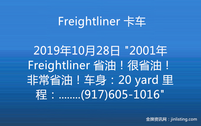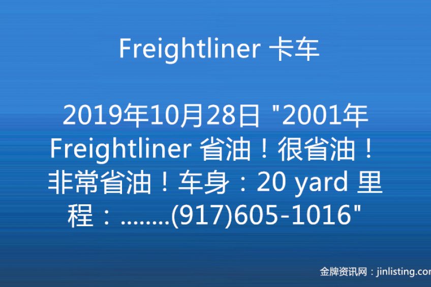 Freightliner 卡车 “2001年Freightliner 省油!很省油!非常省油! 车身:20 yard 里程:150,000 车在纽约市 车保养得好 没有出车祸或其他交通事故 $18,088 如果没人接听请发短信 (917)605-1016”