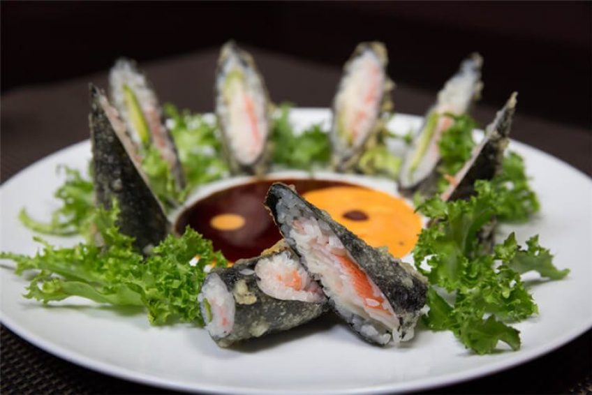 Paradise Roll spicy lobster, shrimp tempura, fried banana wrapped with soy paper and mango sauce  13.00